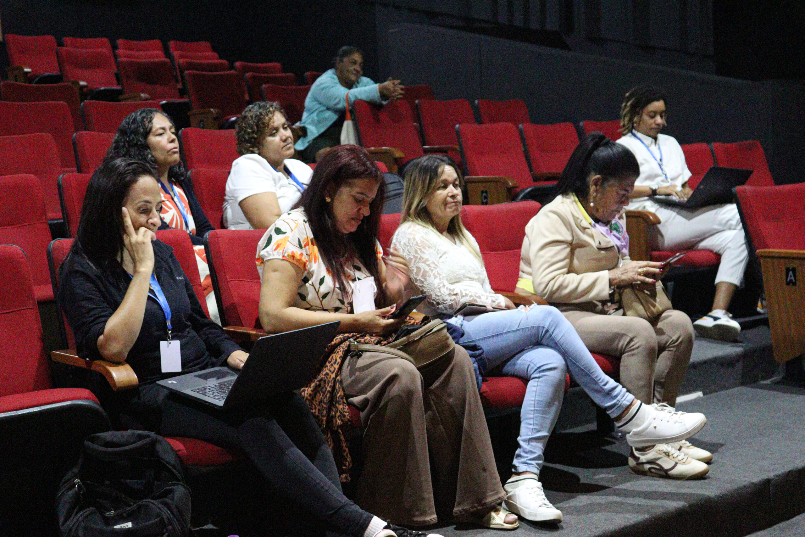 Por ordem: Cecília Godói, Luana Farias, Regiane Farias, Mona Lima, Adriana Mendes e Elaine Bezerra, técnicas da Aedas no debate após exibição dos filmes de plástico | Foto: Felipe Cunha/Aedas
