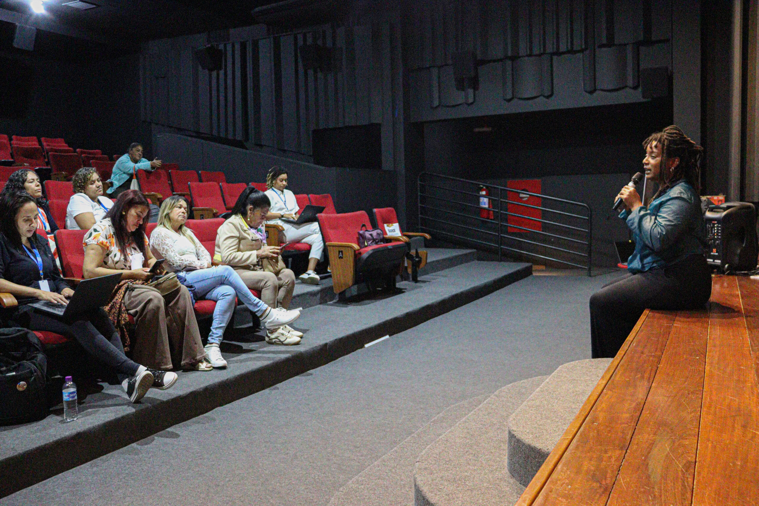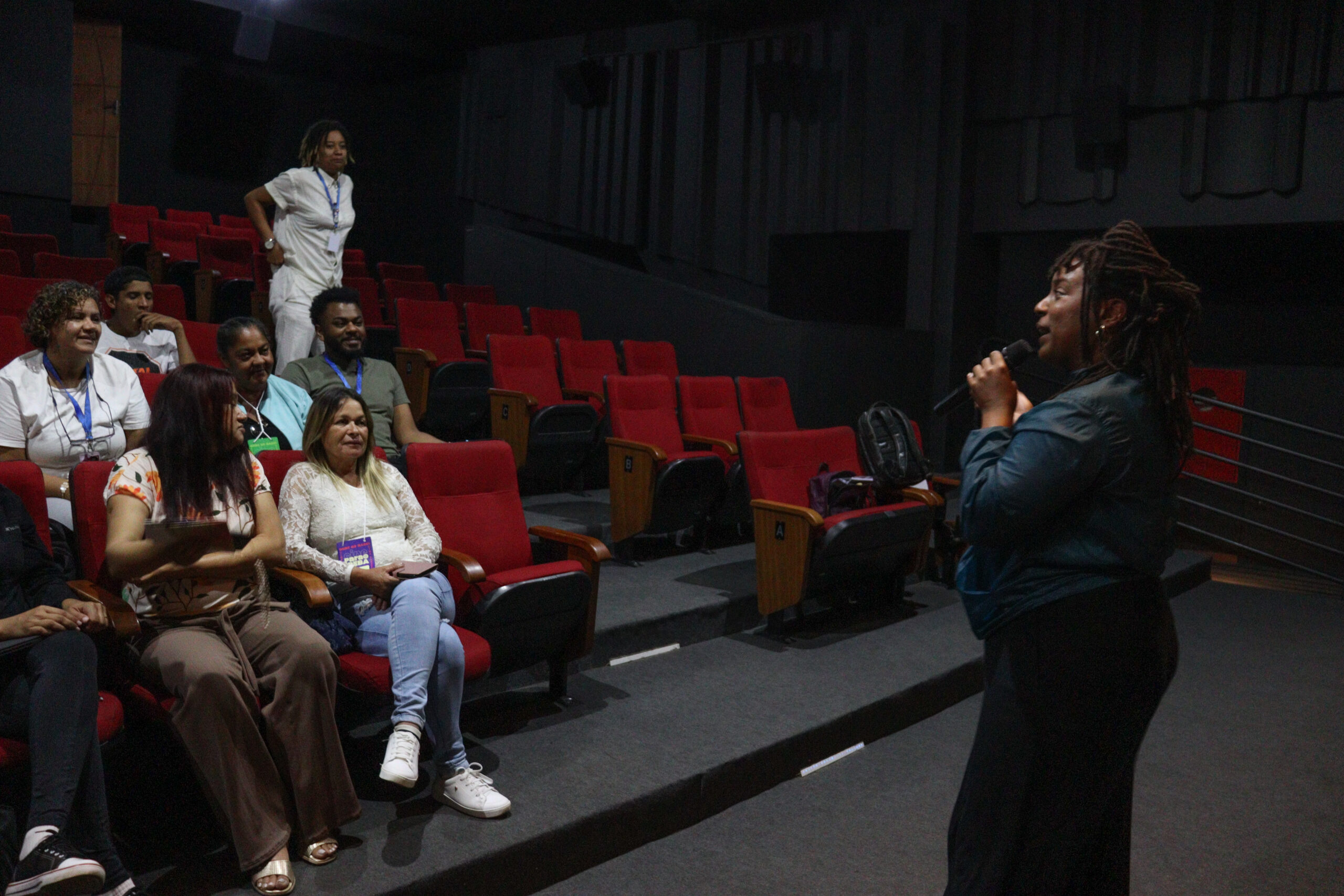 Oficina de Cineclubismo foi realizada na sala de cinema do Cine Santa Tereza, facilitada por Cecília Godói, da Aedas| Foto: Júlia Rohden/Aedas