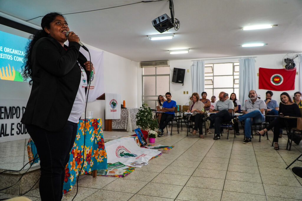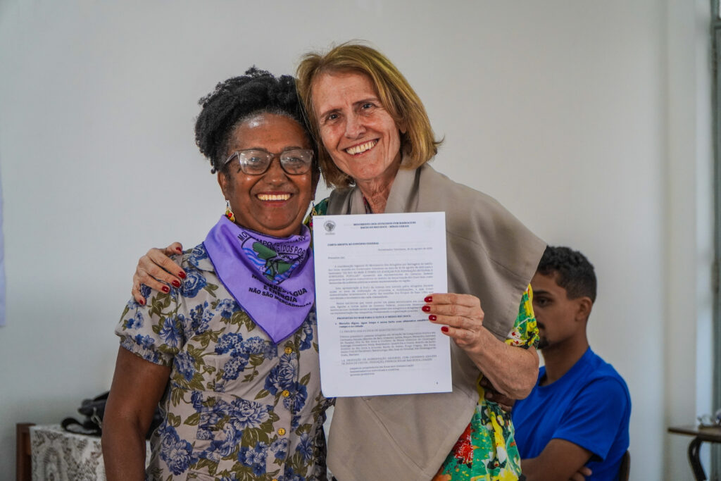 Maria Madalena, do Quilombo Ilha Funda, de Periquito, destacou a importância da luta das mulheres atingidas. “Fui convidada para falar das mulheres, queria falar da criação, podemos fotografar esse momento. Eu vim da Igreja católica, vocês já ouviram falar que a mulher tem que ser obediente? Servidora? Tem que ser bonita para o marido? Mas as mulheres aprenderam a “fotografar” (entender a realidade) também, e viram de cima, que ‘eu tenho que ser bonita para mim também ué’. O homem tem que ser proprietário da mulher? Não. As mulheres são maioria e as suas lutas devem ser consideradas”, destacou chamando os(as) presentes para fechar o momento com um canto: “Para mudar a sociedade do jeito que a gente quer, participamos sem medo de ser mulher!”.