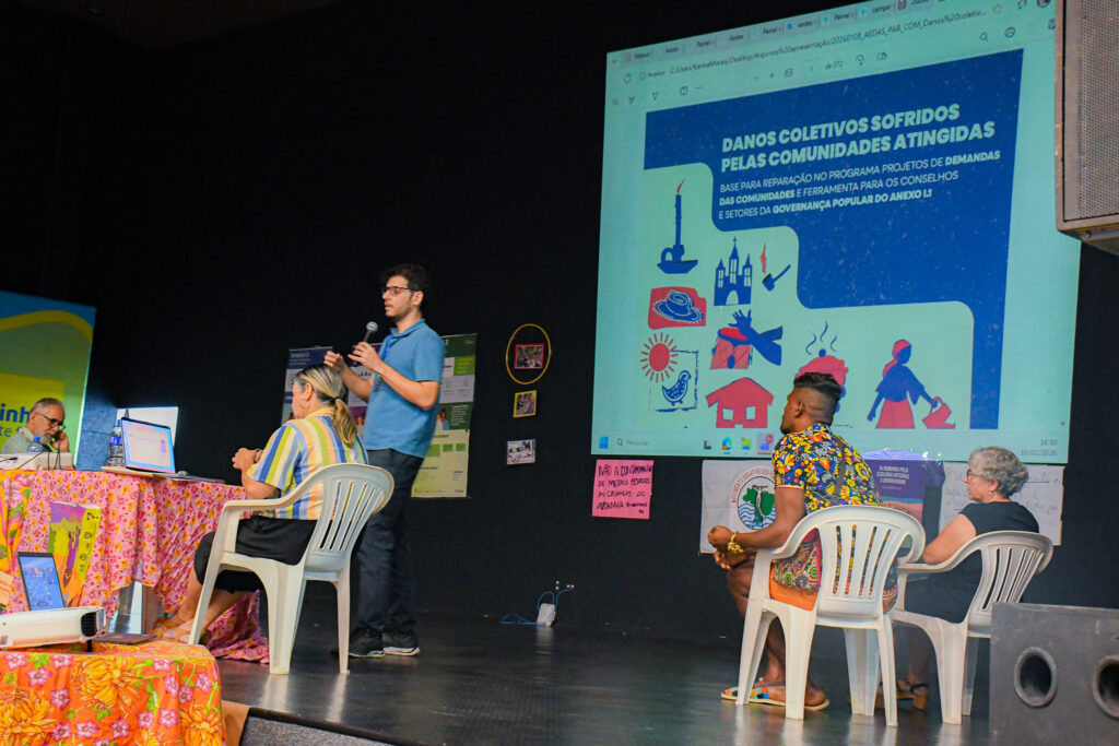 Representantes das pessoas atingidas dos territórios assessorados pela Aedas fizeram parte da mesa do encontro e, após acompanhar a apresentação dos produtos realizados no momento anterior, trouxeram suas percepções sobre o que foi exposto e o momento de encerramento do projeto.