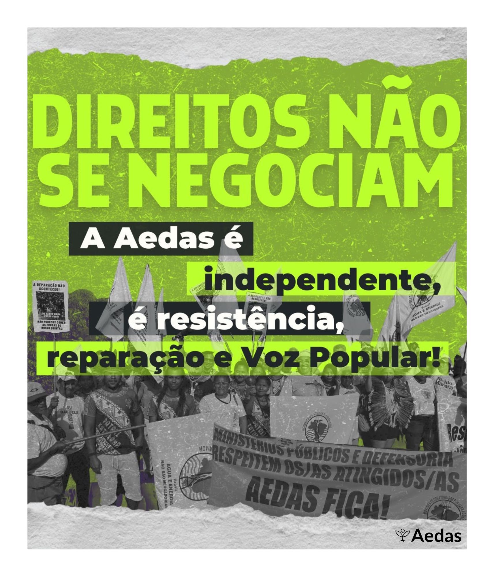 A Aedas permanece firme ao lado das comunidades, buscando os meios legais, lutando para seguir no assessoramento técnico, desde que sejam garantidas as condições adequadas e os recursos necessários para a efetiva participação das pessoas atingidas, que não coloque em risco o seu direito à participação no Anexo I.1.