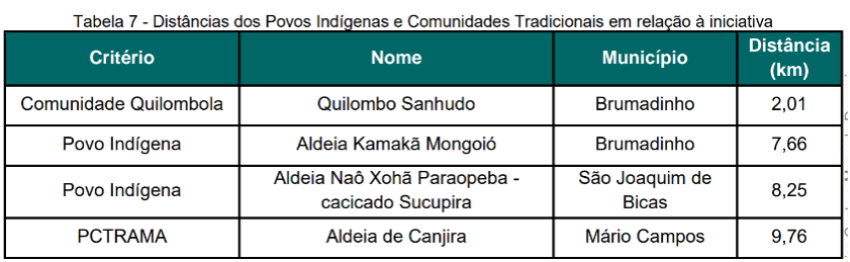 Além das informações citadas, o FDI apresenta o mapeamento dos Povos e Comunidades Tradicionais que estão num raio de 10 km em linha reta em relação ao projeto.