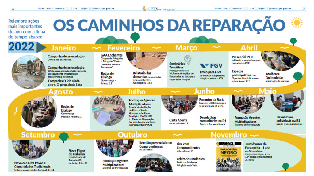 Além disso, vários outros espaços participativos aconteceram este ano com fins de promover a participação informada da população atingida. As reuniões com as Comissões de Atingidos e Atingidas, as Rodas de Diálogo, os Seminários Temáticos sobre Mulheres e os formações com Agentes Multiplicadores foram alguns deles. No próximo ano, a assessoria seguirá acompanhando as demandas e necessidades das comunidades e promovendo espaços de formação, participação e trocas para a construção da reparação integral devida às pessoas atingidas.