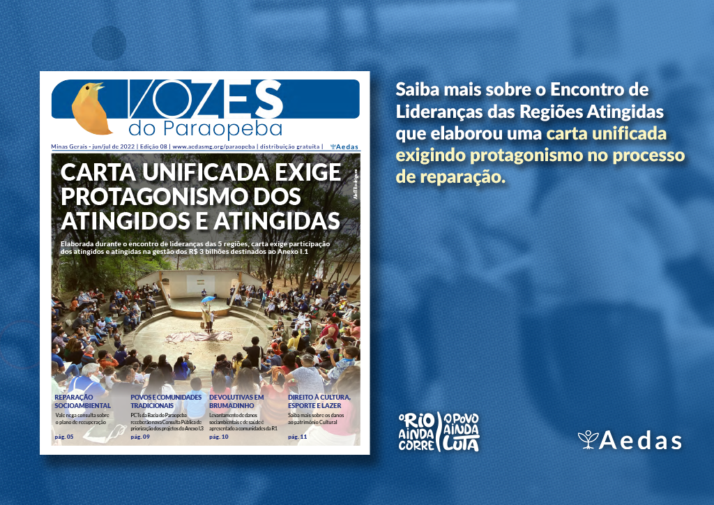 Em março de 2021, a Aedas iniciou o diálogo com as pessoas atingidas sobre os anexos do Acordo Judicial homologado em fevereiro de 2021. Desde então, promovemos, junto aos Agentes Multiplicadores (um coletivo de lideranças comunitárias dedicadas à construção do anexo 1.1), visitas domiciliares, espaços de debate e Intercâmbio Cultural. Com as comunidades atingidas, fizemos formações on-line e presenciais e Rodas de Diálogo para troca de experiências sobre governança popular. Em junho de 2022, aconteceu o Encontro de Atingidos e Atingidas da Bacia do Paraopeba e Lago de Três Marias.Desde a homologação do acordo, as pessoas atingidas constroem propostas para o anexo 1.1, uma vez que, é previsto no texto do acordo, a participação informada desde a sua concepção, passando pela elaboração e execução, chegando à avaliação e acompanhamento dos projetos.