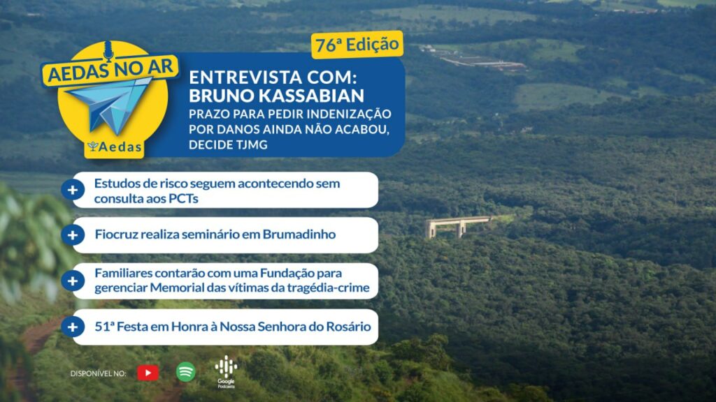 🎙️ Entrevista com Bruno Kassabian, coordenador da equipe de Diretrizes da Reparação Integral (DRI) da Aedas Paraopeba: prazo para pedir indenização por danos causados pelo rompimento da barragem Mina Córrego do Feijão, ocorrido em 25 de janeiro de 2019 em Brumadinho (MG), ainda não acabou, decide Tribunal de Justiça do Estado de Minas Gerais (TJMG).