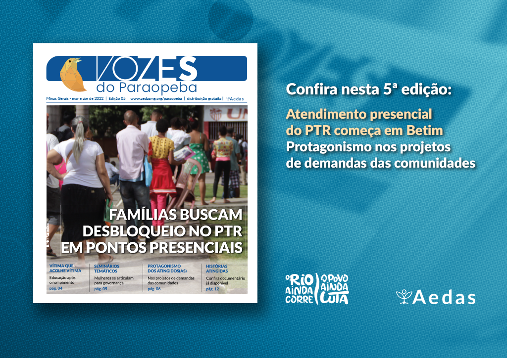 “Famílias tentam desbloqueio do PTR em pontos presenciais” e “Anexo 1.1 coloca atingidos e atingidas como protagonistas” são alguns dos destaques da 5ª Edição do Vozes do Paraopeba, o jornal impresso da Aedas.