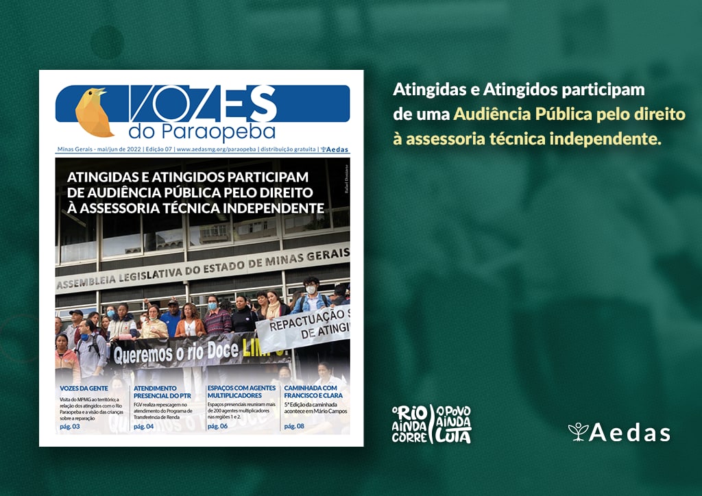 A participação informada e o direito à Assessoria Técnica Independente são assuntos em destaque da mais nova edição do nosso Jornal Vozes do Paraopeba. Essas pautas foram motivo de uma audiência pública realizada em maio na Assembleia Legislativa de Minas Gerais (ALMG), com o objetivo de se debater e, por parte dos atingidos e atingidas, defender esses direitos fundamentais para a caminhada em busca de reparação integral. Estivemos na audiência, conversamos com pessoas que participaram e tratamos disso nessa edição. E mais: