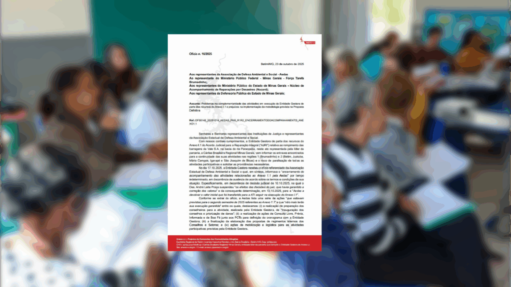 No dia 17 de outubro, a Aedas comunicou à Entidade Gestora e Instituições de Justiça, por meio do ofício “Informe sobre o encerramento do acompanhamento das atividades relacionadas ao Anexo 1.1 do Acordo Judicial de Reparação Integral pela Aedas”, o que será possível garantir em relação às atividades realizadas pela Aedas sobre o Anexo I.1, com a aproximação do fim do Termo de Compromisso de 2023.