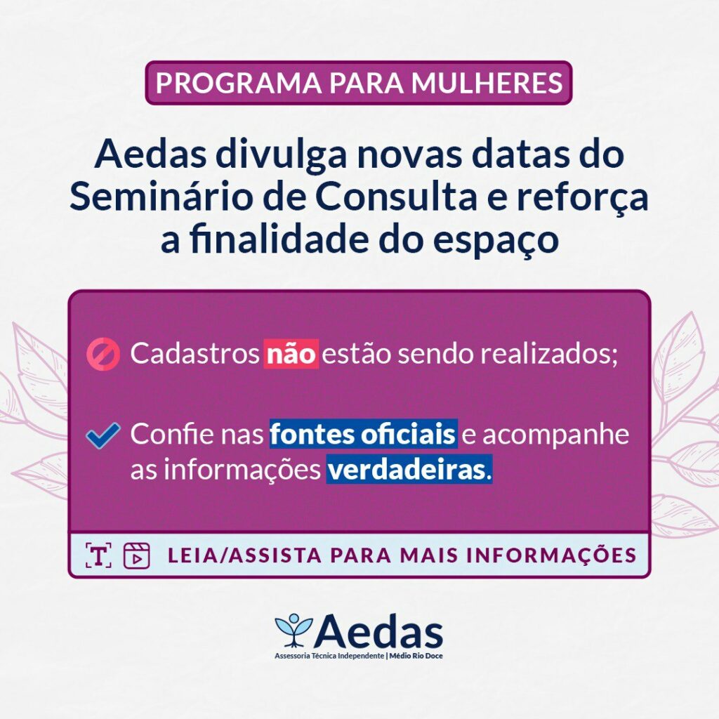 É importante apontar para a alta circulação de Fake News nos territórios. Nos espaços dos Seminários Temáticos não estão sendo realizados cadastros. O Programa para Mulheres ainda está sendo construído! A coleta de assinaturas nos espaços refere-se a registros na lista de presença e assinatura da ata final, documento obrigatório com a consolidação das sugestões propostas pelas atingidas presentes. Informações confiáveis sobre o Programa para Mulheres serão divulgadas nos sites oficiais das Instituições Justiça e nos canais da Aedas.