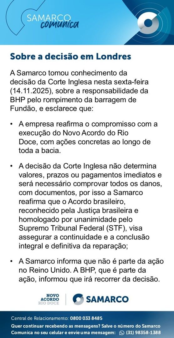 Em nota, a Samarco comunicou que tomou conhecimento da decisão da Corte Inglesa nesta sexta-feira (14/11/2025) a qual determinou a responsabilidade da BHP pelo rompimento da barragem de Fundão e esclareceu que a decisão da Corte Inglesa não determina valores, prazos ou pagamentos imediatos e será necessário comprovar todos os danos. Reafirmou ainda a validade do Novo Acordo homologado pelo Supremo Tribunal Federal no dia 06/11/2024 e informou que a BHP, que é a parte da ação no Reino Unido, irá recorrer da decisão.