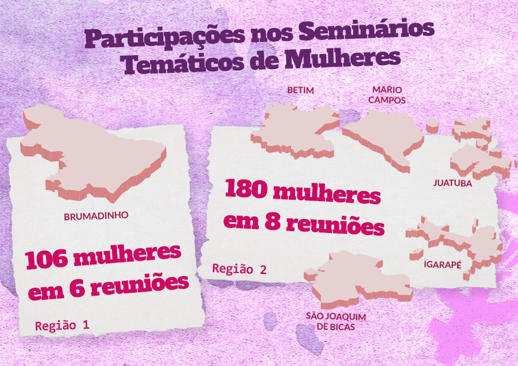 Entre os dias 22 de março ao dia 02 de abril, foram realizados cerca de 14 seminários, sendo seis na Região 1, no município de Brumadinho, com um exclusivo para as mulheres quilombolas. Na Região 2, foram realizados seminários em cada munícipio (Betim, Igarapé, Juatuba, Mário Campos, São Joaquim de Bicas) e um exclusivo para as mulheres atingidas que fazem parte dos Povos e Comunidades de Tradição Religiosa de Matriz Ancestral (PCTRAMA).