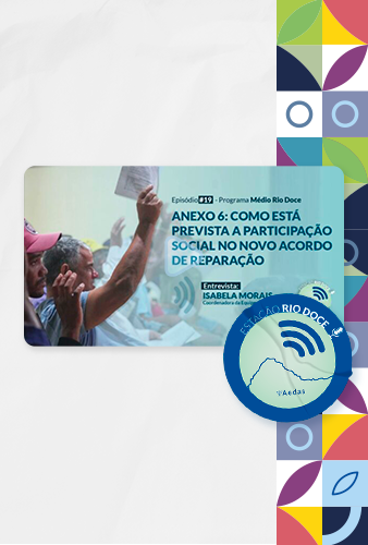 O eixo temático Participação e Controle Social concentra-se em assegurar o direito à informação e participação das pessoas atingidas, bem como as diretrizes para o exercício do controle social. Nele são discutidos temas como: Fundo de Participação Social; Projetos comunitários; Conselho Federal de Participação Social da Bacia do Rio Doce; direito à Assessoria Técnica Independente e iniciativas estaduais.